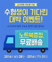 고시마트는 일부 도서를 제외한 도서 배송료 할인 이벤트와 함께 '대한민국 수험생들이 가장 사랑하는 도서·인강 사이트' 맞추기 등을 통해 노트북, 신세계상품권, 스타벅스 기프티콘 등을 제공할 예정이다.