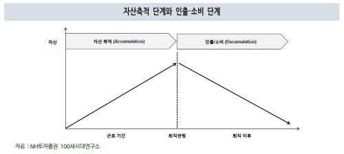 이에 NH투자증권 100세시대연구소에서는 퇴직 이후 30~40년을 살아가는 동안 근로기간 축적한 노후자금을 조기 소진하지 않도록 잘 배분해 사용하는 '인출 전략'이 필요하다고 조언합니다.