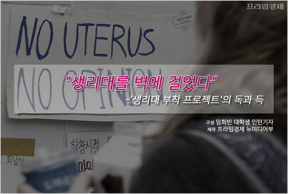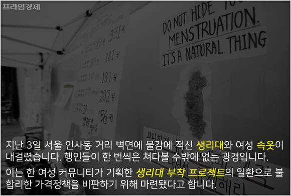 [프라임경제] 지난 3일 오전 서울 인사동 거리 벽면에 물감에 적신 생리대와 여성 속옷이 내걸렸습니다. 행인들이 한 번씩은 쳐다볼 수밖에 없는 광경입니다. 이는 한 여성 커뮤니티가 기획한 '생리대 부착 프로젝트'로 여성에게 필수 불가결한 생리대의 가격인상을 비판하기 위해 마련됐다고 합니다.