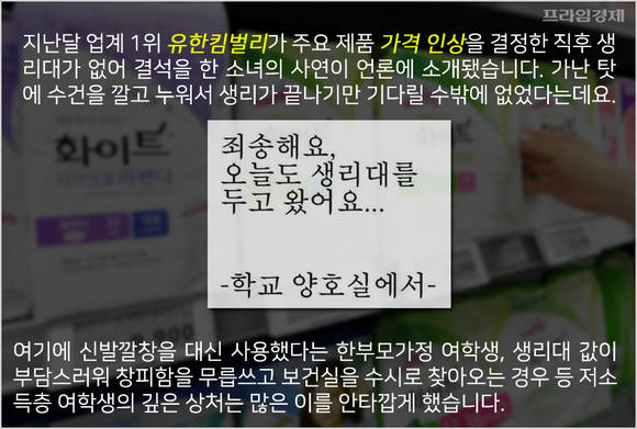 지난달 업계 1위 유한킴벌리가 주요 제품 가격 인상을 결정한 직후 생리대가 없어 결석을 한 소녀의 사연이 언론에 소개됐습니다. 가난 탓에 수건을 깔고 누워서 생리가 끝나기만 기다릴 수밖에 없었다는데요.