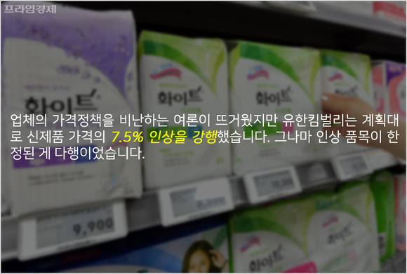 업체의 가격정책을 비난하는 여론이 뜨거웠지만 유한킴벌리는 계획대로 신제품 가격의 7.5% 인상을 강행했습니다. 그나마 인상 품목이 한정된 게 다행이었습니다.