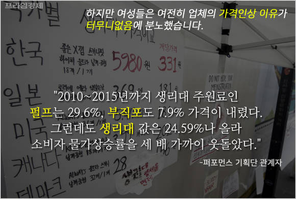 하지만 여성들은 업체의 가격인상 이유가 터무니없음에 분노했습니다. 퍼포먼스 기획자인 위마드 측은 "2010~2015년까지 생리대 주원료인 펄프 가격은 29.6% 하락했고 부직포도 7.9% 값이 내렸는데도 생리대 값은 24.59%나 올라 소비자 물가상승률을 세 배 가까이 웃돌았다"고 지적했습니다.
