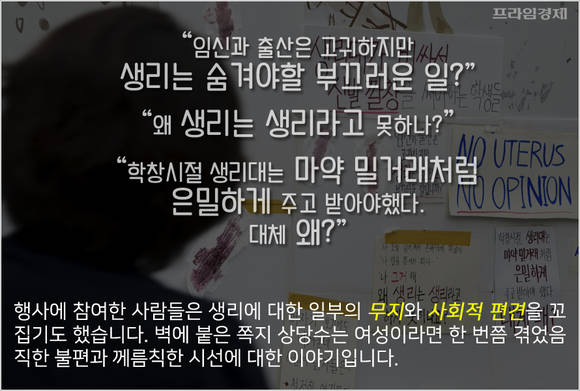 벽면에는 '생리대 비싸서 신발 깔창 써야하는 학생들' '임신과 출산은 고귀하지만 생리는 숨겨야 할 부끄러운 일?' '학창시절 생리대는 마약 밀거래처럼 은밀하게 주고받아야 했다. 대체 왜?' 등의 문구가 빼곡하게 붙었습니다. 여성이라면 한 번쯤 겪었음직한 불편과 께름칙한 시선에 대한 반발입니다.