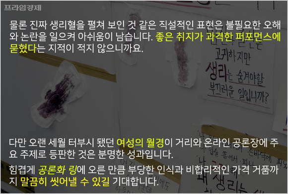 물론 진짜 생리혈을 펼쳐 보인 것 같은 표현방식은 불필요한 오해와 논란을 일으킨다는 점에서 아쉬움이 남습니다. 좋은 취지가 과격한 표현에 묻혔다는 지적이 적지 않으니까요.