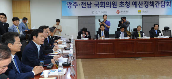 광주광역시는 전남도와 함께 5일 낮 국회 의원회관 제8간담회장에서 광주·전남 및 지역출신 국회의원, 국회 사무총장 등 23명이 참석한 가운데 2017년도 지역 현안사업 국비확보를 위한 예산정책간담회를 개최했다.