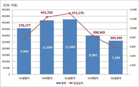 예탁원 관계자는 "지난해 중국발 금융위기 및 홍콩H지수 급락으로 인한 ELS 발행시장이 위축됐다"며 "원금손실위험에 따른 불안감으로 투자자 이탈현상이 지속 증가함에 따라 올 상반기까지 회복하지 못하고 있는 상황"이라고 진단했다.