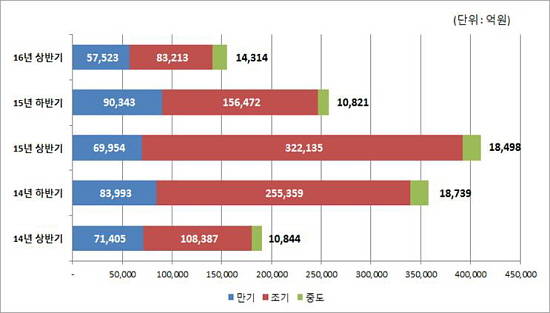 한편, ELS 상환액은 15조5050억원으로 전년 동기대비 62.2% 감소했다. 상환 유형별로는 조기상환이 53.7%(8조3213억원)였고, 만기상환과 중도상환은 각각 37.1%(5조7523억원), 9.2%(1조4314억원)을 기록했다.