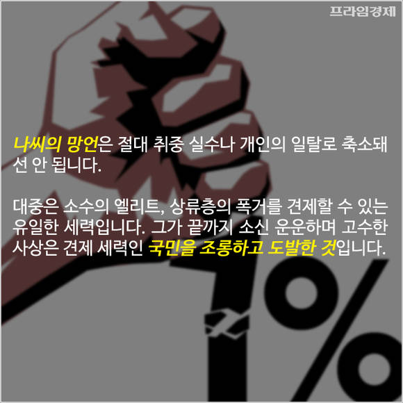 나씨의 망언은 절대 취중 실수나 개인의 일탈로 축소돼선 안 됩니다. 대중은 소수의 엘리트, 상류층의 폭거를 견제할 수 있는 유일한 세력입니다. 그가 끝까지 소신 운운하며 고수한 사상은 견제 세력인 국민을 조롱하고 도발한 것입니다.
