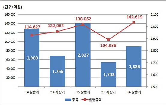 모집구분별로는 공모발행이 2조3458억원으로 전체 발행금액의 16.4%, 11조9161억원의 사모발행이 83.6%를 차지했다. 작년 하반기 대비 공모는 23.9%, 사모는 39.9% 발행량이 늘어났다.