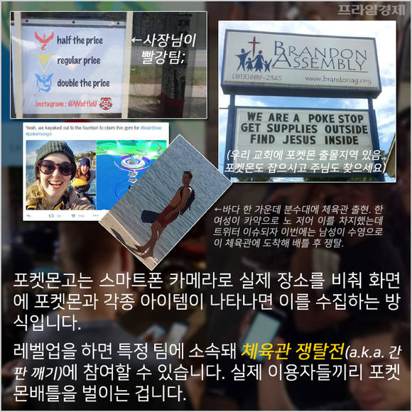 게임은 스마트폰 카메라로 실제 장소를 비추면 화면에 포켓몬과 각종 아이템이 나타나고 이를 수집하는 방식입니다. 일정 수준 레벨업을 하면 팀에 소속돼 '체육관' 쟁탈전에 참여할 수 있습니다. 이미 팀별로 혜택을 달리 주는 식당과 매장이 등장할 만큼 사회적인 현상이 됐습니다.