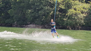 이렇게 물 위로 올라오게 되면 처음에는 보트 뒤를 따라가기만 해도 힘이 듭니다. 조금씩 자세가 안정되면 좌우로 왔다 갔다 할 수 있고, 보트가 일으키는 파도를 넘어 다니면 초보는 마스터했다고 볼 수 있습니다.