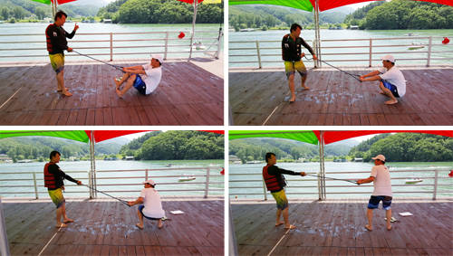 부상 시에는 발바닥으로 물을 버티지 말고 45도 느낌으로 물 위에 오르는 느낌이 중요합니다. 팔로 당기는 것이 아니라 팔과 발은 보트의 힘을 버티고 굽혀졌던 허리를 펴면서 배를 내미는 느낌이 들도록 일어나면 됩니다.