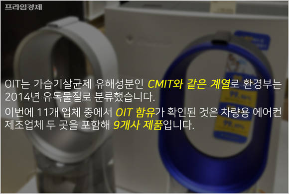 11개 업체 중에서 OIT 함유가 확인된 것은 차량용 에어컨 제조업체 두 곳을 포함해 9개사입니다. OIT는 가습기살균제 유해성분인 CMIT와 같은 계열이라 환경부는 2014년 유독물질로 분류했습니다.