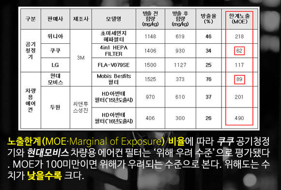 특히 노출한계(MOE) 비율에 따라 쿠쿠 공기청정기와 현대모비스 차량용 에어컨 필터는 위해가 우려되는 것으로 평가됐습니다. MOE(Marginal of Exposure)는 무영향관찰농도를 노출수준으로 나눈 안전비율입니다. 수치가 100 미만이면 위해가 우려되는 수준으로 보며 위해도는 수치가 낮을수록 큽니다.