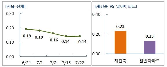 [프라임경제] 부동산 114에 따르면 7월 셋째주 서울 아파트 매매가격 변동률은 0.14%로 한 주 전과 같은 수준을 유지했다.