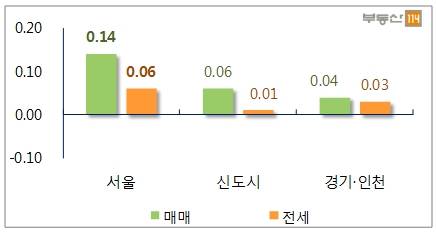 경기·인천은 △광명(0.12%) △안양(0.10%) △고양(0.09%) △구리(0.08%) △시흥(0.08%) △성남(0.07%) △인천(0.06%) △수원(0.05%) △의정부(0.05%) 순으로 매매가가 상승했다.