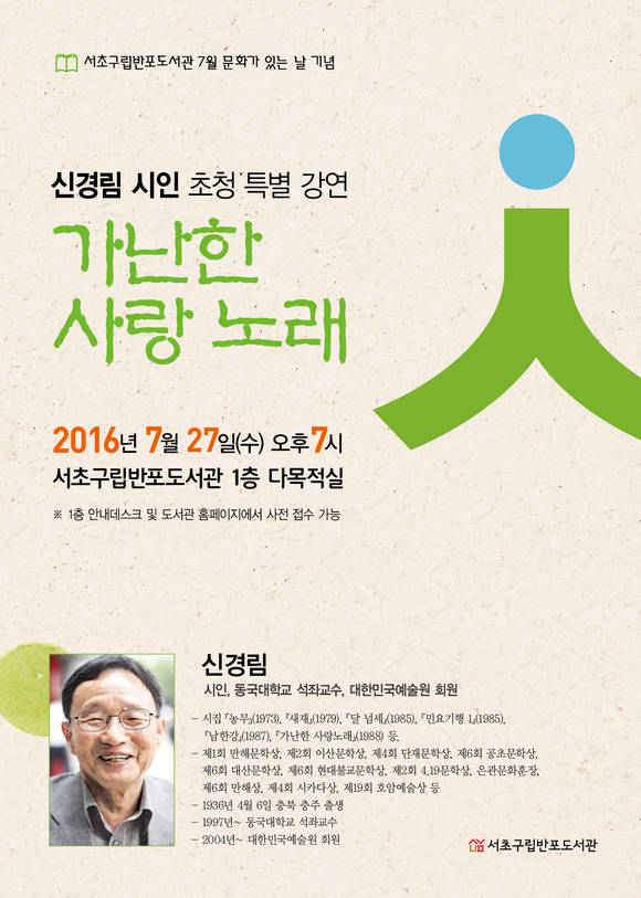 [프라임경제] 서초구립반포도서관은 오는 27일 오후 7시에 신경림 시인을 초청해 '가난한 사랑 노래'를 주제로 특별 강연을 연다.