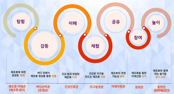 '건강인류관'은 미래식량자원으로서 해조류를 소개하고 해외 해조류 음식을 소개한다. '지구환경관'은 지구온난화로 인한 파괴된 바다 생태계를 해조숲 조성으로 복원시키는 내용을 VR(가상현실)체험을 통해 지구와 해조류의 관계를 보여준다.