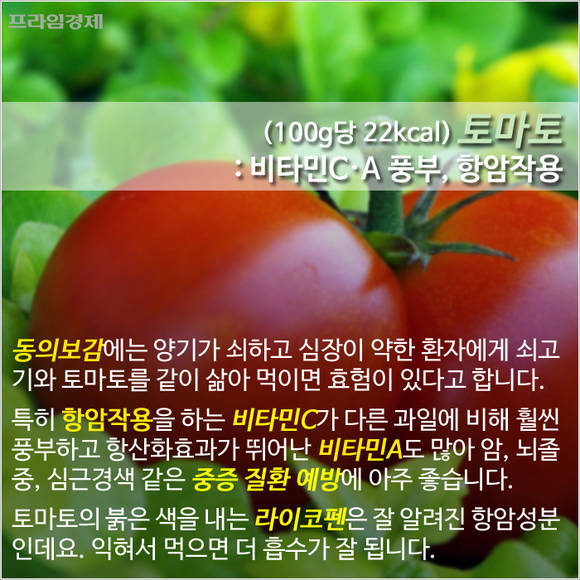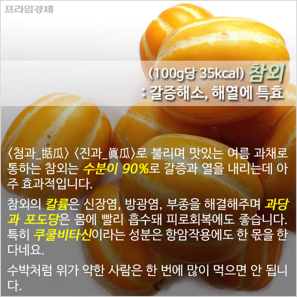 공교롭게도 여름 과채 대부분은 알칼리성입니다. 무너진 몸 속 산도를 회복시키고 풍부한 유기산은 피로물질을 몸 밖으로 배출해줍니다. 또 식욕을 돋우고 무기질, 비타민, 당분을 골고루 담고 있어 전해진 불균형도 해결해줘 꼭 챙겨 먹어야할 보양식인 셈입니다.