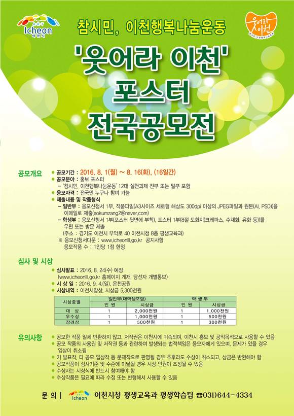 [프라임경제] 경기 이천시(시장 조병돈)는 다음 달 1일부터 16일까지 전 국민을 대상으로 참시민·이천행복나눔운동 '웃어라 이천 포스터'를 공개모집한다고 28일 밝혔다.