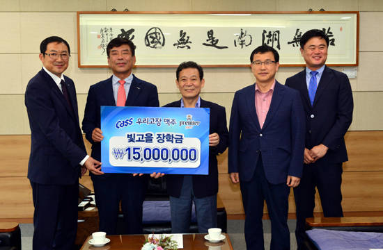 [프라임경제]윤장현 광주광역시장은 28일 오후 시청 3층 접견실에서 조승훈 OB맥주 호남본부장으로부터 빛고을장학금 1500만원을 전달받았다. (