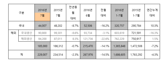 특히 해외생산 분 판매는 미국 및 슬로바키아공장의 휴가가 지난해와는 달리 7월에만 편성돼 전년 대비 근무일수가 크게 줄었음에도 멕시코공장의 가동 본격화와 SUV 모델들을 중심으로 한 중국공장의 판매 확대를 바탕 삼아 전년대비 8.3% 증가했다.