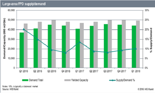 IHS의 Display Supply Demand & Equipment Tracker에 따르면 FPD 수요는 올해부터 2018년까지 면적 기준 매년 5~6% 증가할 것으로 예상된다. 하지만 생산능력은 많은 공급량 축소 정책으로 2017년 단 1%에 불과해 공급부족 현상이 예상된다.