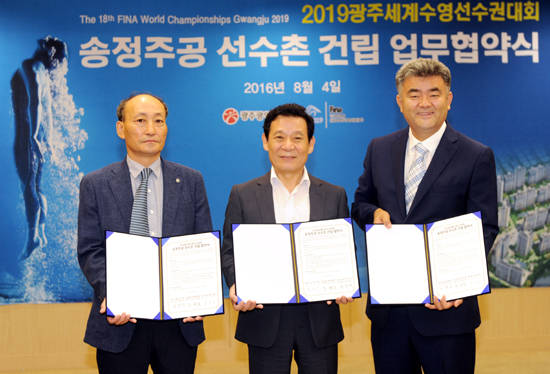 [프라임경제] 광주광역시는 4일 오전 광주시청 비즈니스룸에서 송정주공재건축정비사업조합, 중흥건설㈜과 2019광주세계수영선수권대회 선수촌 건립 협약을 체결했다.