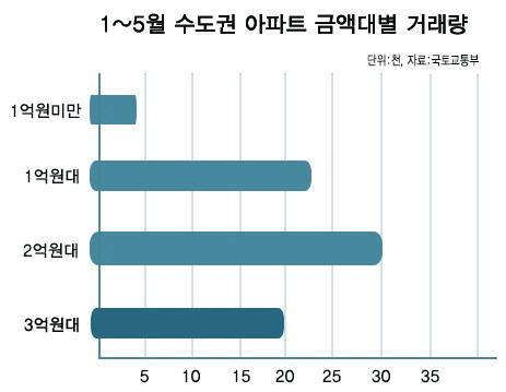 [프라임경제] 국토교통부 실거래가 자료를 금액대·지역별로 살펴본 결과, 올해 1~5월 수도권에서 가장 많이 거래된 아파트는 3억원대 이하였다. 총 10만5744건 거래 중 3억원대 이하 아파트 거래량이 7만7107건으로 집계된 것.