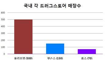관련 업계에 따르면 올 8월 현재 3대 드러그스토어 매장수는 올리브영 500개, 왓슨스 150곳, 롭스 70곳이다.