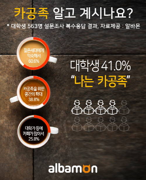 아르바이트 포털 알바몬(대표 윤병준)이 최근 대학생 563명을 대상으로 '카공족'에 관한 설문조사를 실시했다.