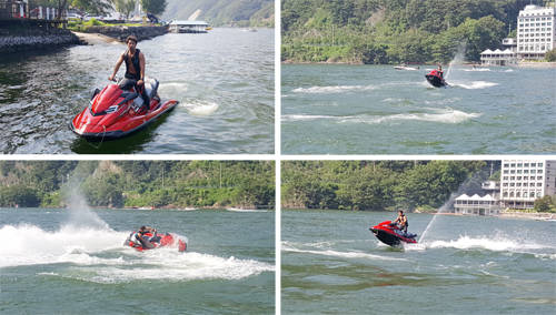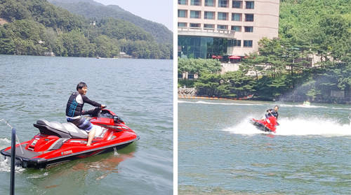 이렇게 어느 정도 조정에 익숙해지면 고급 기술 등을 배울 수 있습니다. 필자는 아직 초보라 고급기술은 소풍수상레저를 자주 방문하는 배우 이민호씨가 △점프 △급선회 △잠항 시범을 보여줘 필자의 열의를 불태웠습니다.