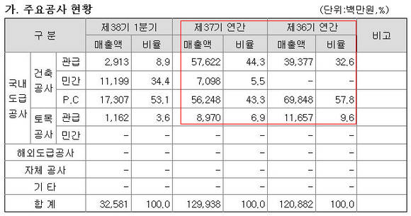 시공능력평가액 기준으로는 지난해 156위에 그쳤지만 한국토지주택공사를 상대로 한 관급 건축공사 수주와 PC공사(부재를 공장에서 생산, 현장에서 조립하는 시스템),건물임대(씨티은행) 수익이 주요 수입원이다.