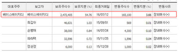 지난달 12일 기준 최대주주는 베이스에이치디(대표 윤정치)로 54.76%의 지분을 보유하고 있다. 베이스에이치디(옛 베이스컨설팅)는 기타금융 업종으로 분류돼 있으며 경영컨설팅과 부동산 관리를 주요 사업으로 내세우고 있다.
