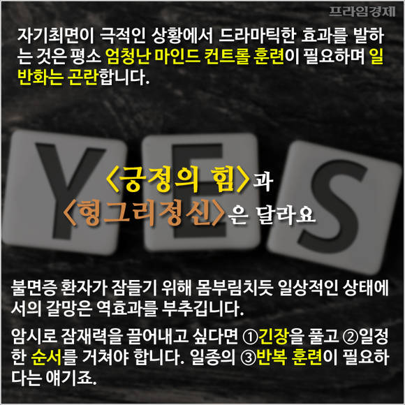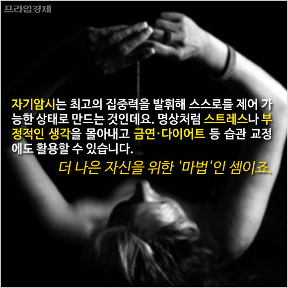 자기최면은 최고의 집중력을 발휘해 스스로를 제어 가능한 상태로 만드는 것인데요. 명상과 마찬가지로 스트레스나 부정적인 생각을 몰아내고 금연·다이어트 등 습관 교정에도 활용할 수 있습니다. 더 나은 자신을 위한 '마법'인 셈이죠.