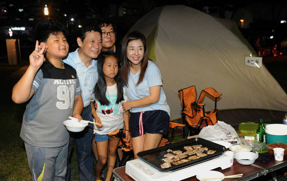 [프라임경제]윤장현 광주광역시장이 시청 잔디광장 캠핑장에 들려 열대야 속에서 무더위를 이겨내기 위해서 나온 시민들과 만나 정겨운 이야기를 나누고 있다.