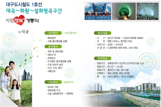 대구시는 9월8일 오전 10시30분 중앙·지역 주요기관장, 국회의원, 시의원, 달성군민 등 600여명이 참석한 가운데 '1호선 서편연장구간 시민 행복 개통식' 행사를 전개한다. 개통식은 축하공연부터 개회, 경과보고, 개통선포 등의 공식행사와 테이프 절단, 영업운행신고, 시승 순으로 진행된다.