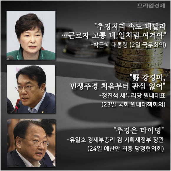 이에 맞서 기획재정부와 새누리당은 '민생예산의 조속 처리'를 주장하며 야당에 날을 세웠고 이튿날 국회 예산기획처 역시 이번 추경이 무산될 경우 일자리 7만3000개, 성장률 0.3%p가 날아갈 수 있다고 경고했습니다.