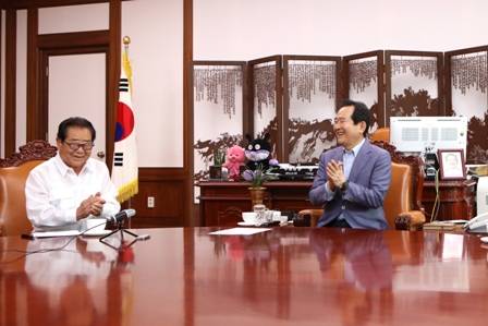 [프라임경제] 정세균 의장은 24일 오후 3시 의장집무실에서 국민MC 송해의 '청년 SOS펀드'에 후원금을 전달했다.