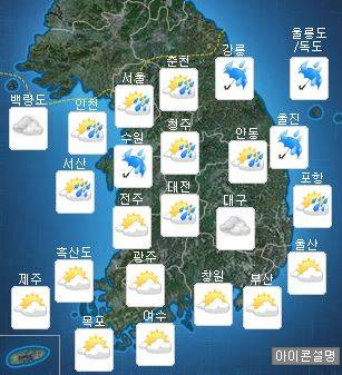 중부지방은 흐리고 오전까지 비(강수확률 60∼90%)가 오는 곳이 있겠고, 남부지방은 구름이 많고 대기불안정에 의해 오후에 남부 내륙지역을 중심으로 소나기(강수확률 60%)가 오는 곳이 있을 것으로 보인다.