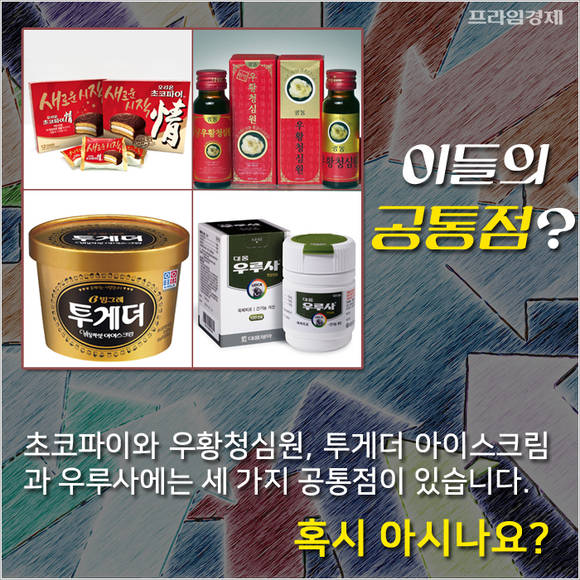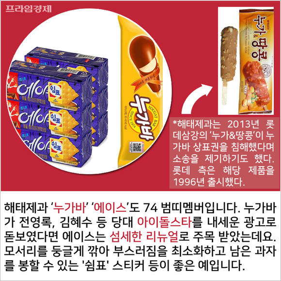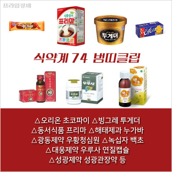 1974년 이른바 '범띠클럽' 제품들로는 △오리온 초코파이 △빙그레 투게더 △동서식품 프리마 △해태제과 누가바 △광동제약 우황청심원 △녹십자 백초 △대웅제약 우루사 연질캡슐 △성광제약 성광관장약 등이 꼽히는데요.