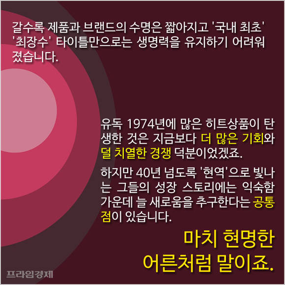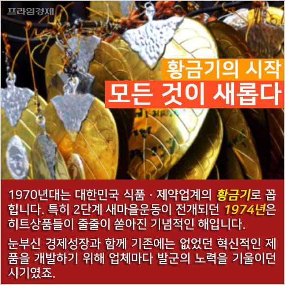 [프라임경제] 1970년대는 대한민국 식품·제약업계의 황금기로 꼽힙니다. 특히 2단계 새마을운동이 전개되던 1974년은 지금까지 롱런하는 히트상품들이 줄줄이 쏟아진 기념적인 해입니다. 눈부신 경제성장과 함께 기존에는 없었던 혁신적인 제품을 개발하기 위해 업체마다 발군의 노력을 기울이던 시기였죠.
