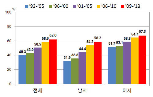 보건복지부와 국립암센터의 '2013년 암발생률, 암 생존율 및 암유병률 현황'에 따르면 2009년에서 2013년 암환자 5년 생존율이 69.4%로 2001년에서 2005년 53.8%대비 15.6% 높아진 것을 알 수 있다.