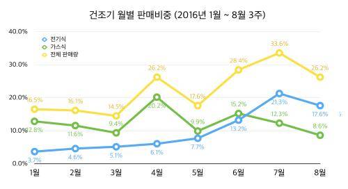 이는 습한 날씨에 빨래 건조 시간이 다른 계절보다 오래 걸리고 폭염에 빨래감도 많아 여름을 기점으로 빨래건조기 판매량이 크게 증가한 것으로 풀이된다.