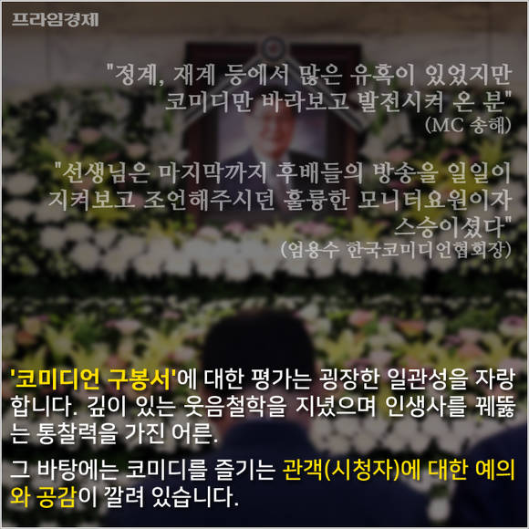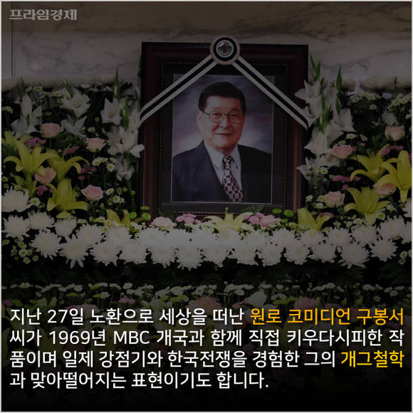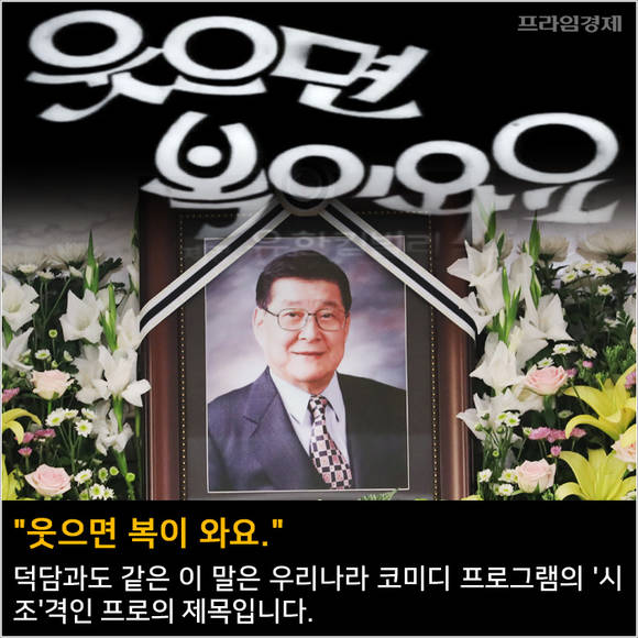 [프라임경제] "웃으면 복이 와요." 덕담과도 같은 이 말은 사실 우리나라 코미디 프로그램의 '시조'격인 프로의 제목입니다. 지난 27일 노환으로 세상을 떠난 원로 코미디언 구봉서씨가 1969년 MBC 개국과 함께 고인이 성장하고 직접 키운 프로그램이며 일제 강점기와 한국전쟁을 경험한 그의 개그철학과 맞아떨어지는 표현이기도합니다.