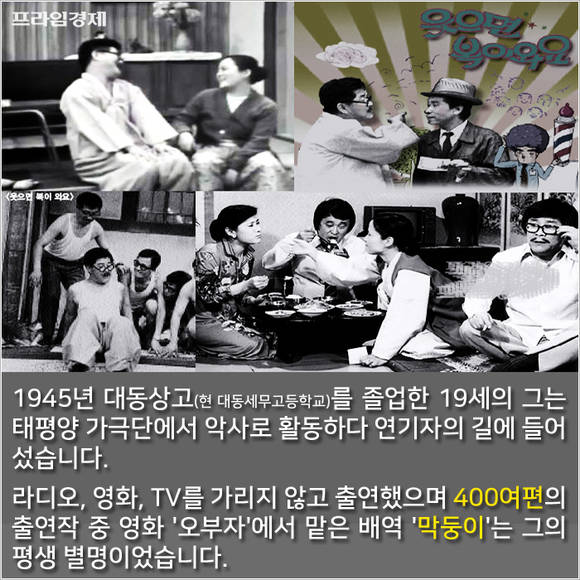 1945년 대동상고(현 대동세무고등학교)를 졸업한 19세의 그는 태평양 가극단에서 악사 생활을 하다 본격적인 연기자의 길에 들어섰습니다. 라디오, 영화, TV를 가리지 않고 출연한 만능 엔터테이너였죠. 400여편의 출연작 중에서 특히 1958년작 영화 '오부자'에 맡은 '막둥이'라는 배역은 그의 별명으로 굳어졌습니다.