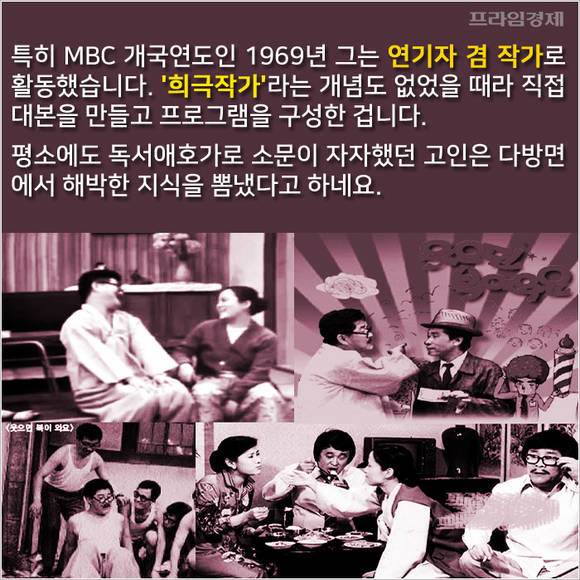 특히 MBC 개국연도인 1969년 그는 연기자 겸 작가로 활동했습니다. '희극작가'라는 개념도 없었을 때라 직접 대본을 만들고 프로그램을 구성한 겁니다. 평소에도 독서애호가로 소문이 자자했던 고인은 다방면에서 해박한 지식을 뽐냈다고 하네요.