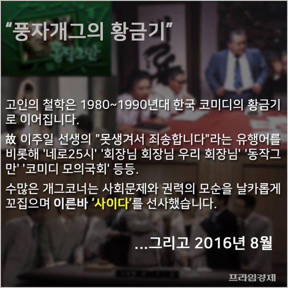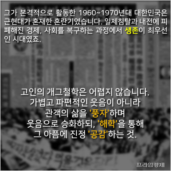 고인의 철학은 1980~1990년대 한국 코미디의 황금기로 이어집니다. 고(故) 이주일 선생의 "못생겨서 죄송합니다"라는 유행어를 비롯해 '네로25시' '회장님 회장님 우리 회장님' '동작그만' '코미디 모의국회' 등등. 수많은 개그코너는 사회문제와 권력의 모순을 날카롭게 꼬집으며 이른바 '사이다'를 선사했습니다.