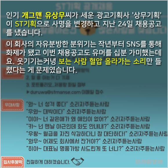 인기 개그맨 유상무씨가 세운 광고기획사 '상무기획'이 'ST기획'으로 사명을 변경하고 지난 24일 채용공고를 냈습니다. 이 회사의 자유분방한 분위기는 작년부터 SNS를 통해 화제가 됐고 이번 채용공고도 유머를 십분 가미했는데요. 문제는 전혀 웃기지 않을 뿐더러 보는 사람 혈압 올라가는 소리만 들렸다는 겁니다.