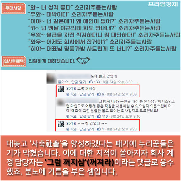 대놓고 '사축(社畜)'을 양성하겠다는 패기에 누리꾼들은 기가 막혔습니다. 이에 대한 지적이 쏟아지자 회사 계정 담당자는 '그럼 꺼지삼'이라는 댓글로 응수했죠. 분노에 기름을 부은 셈입니다.